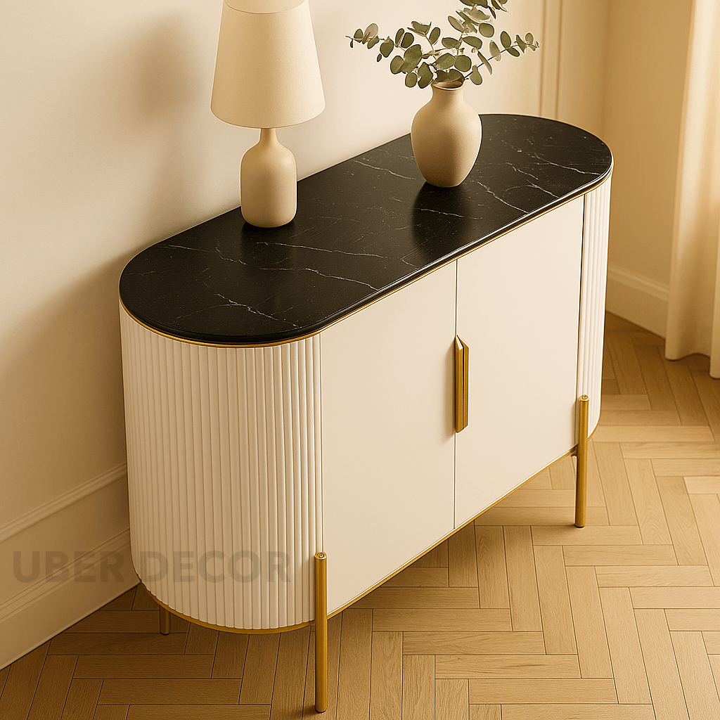 Aria Elegance Side or Console Table – Custom Black or White Marble Top with Fluted White Cabinet Mid‑Century Glam Accent