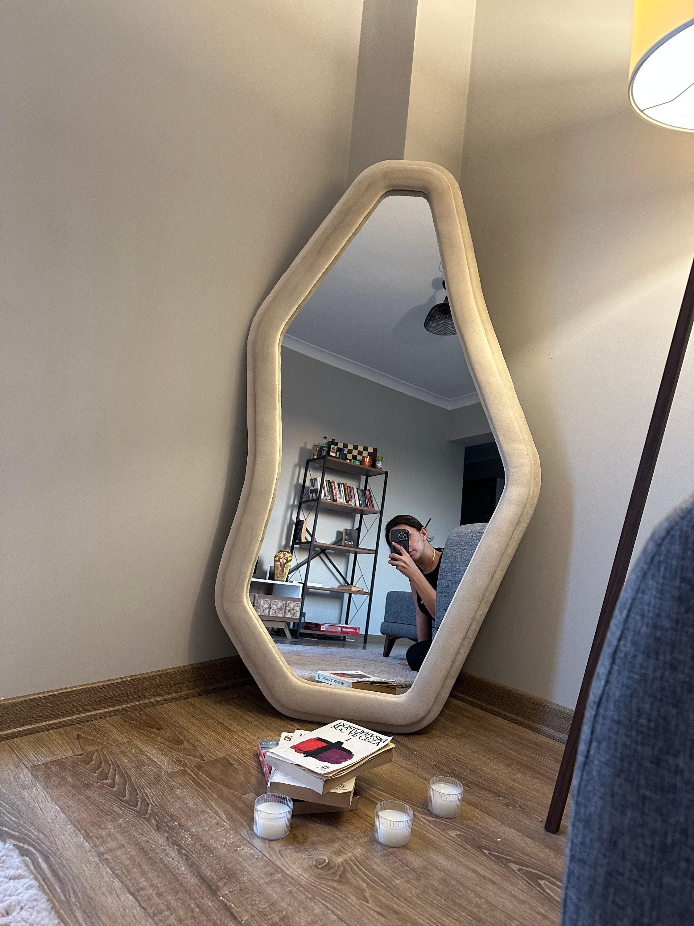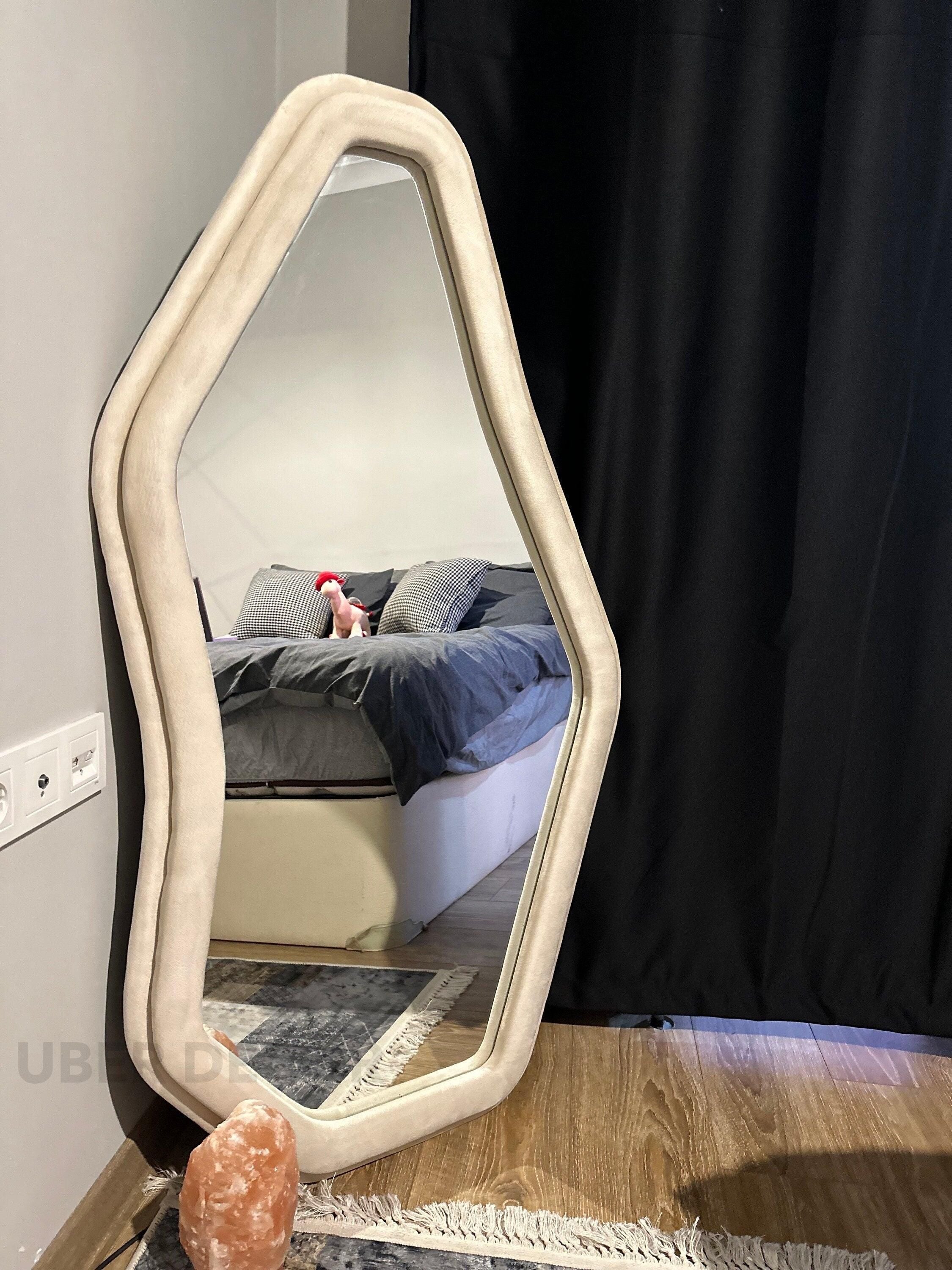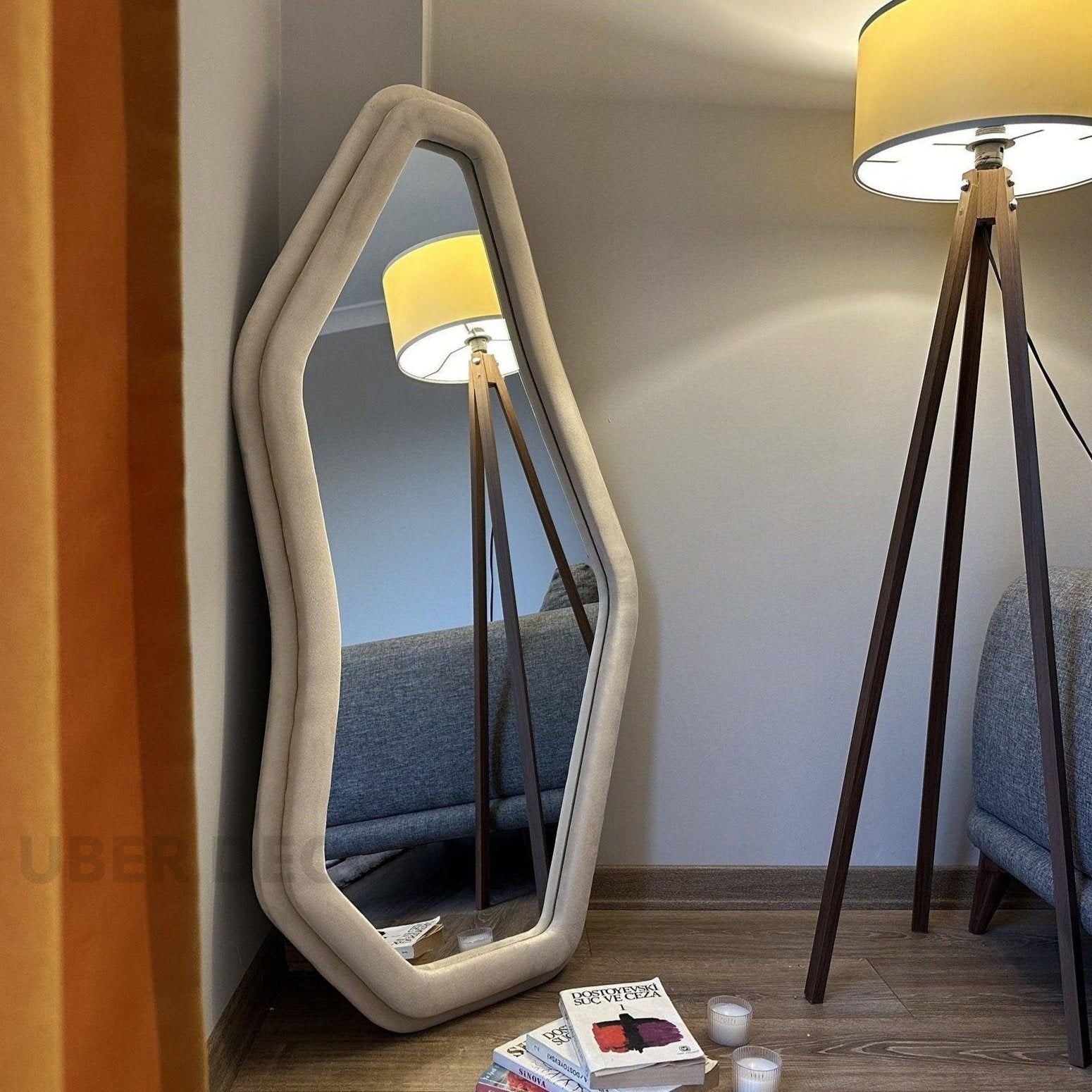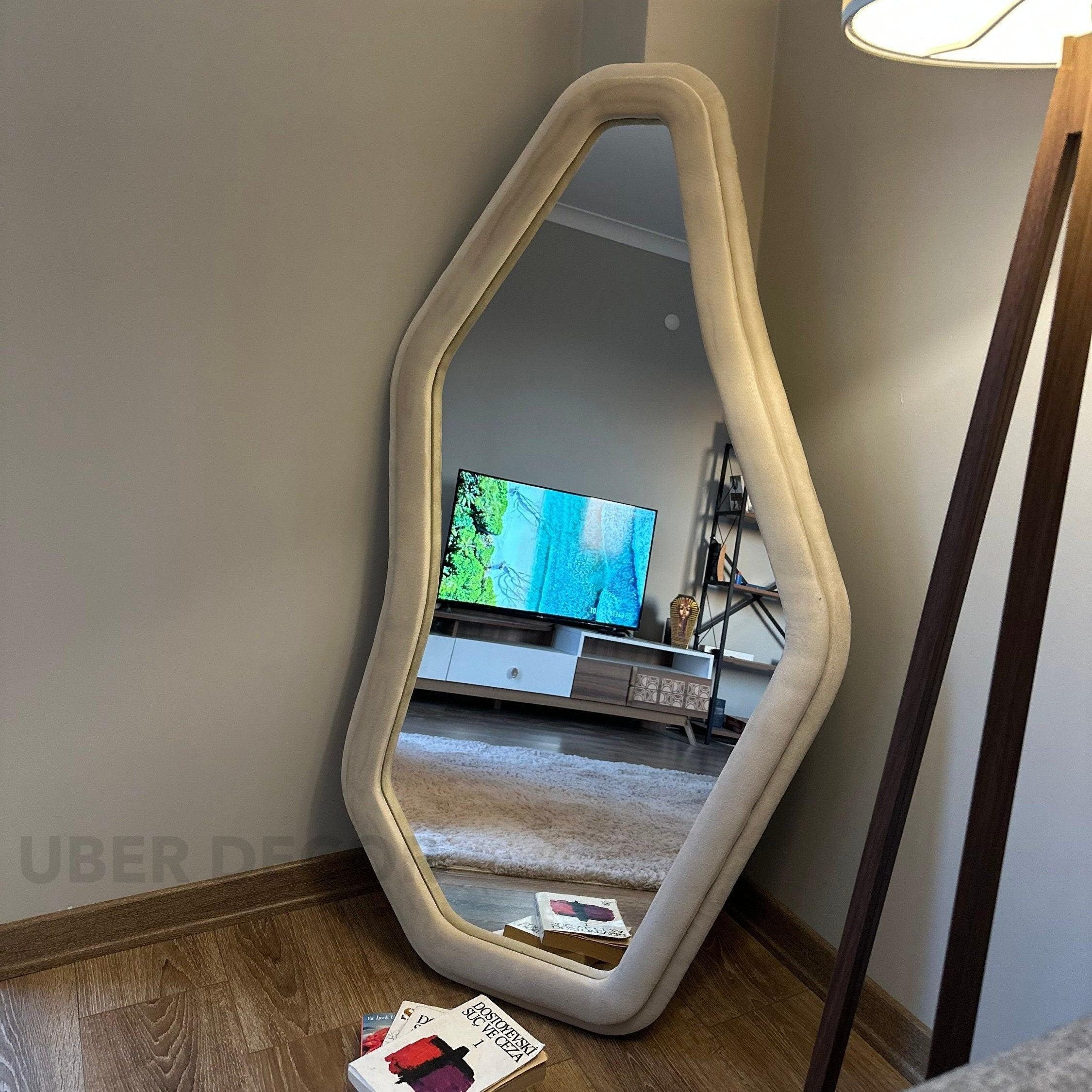 EdgeCraft Irregular Asymmetric Wall Mirror- Suede Velvet Upholstered Frame Fabric Mirror for Bedroom