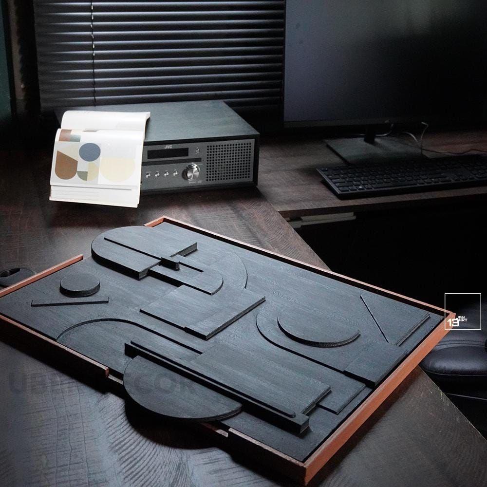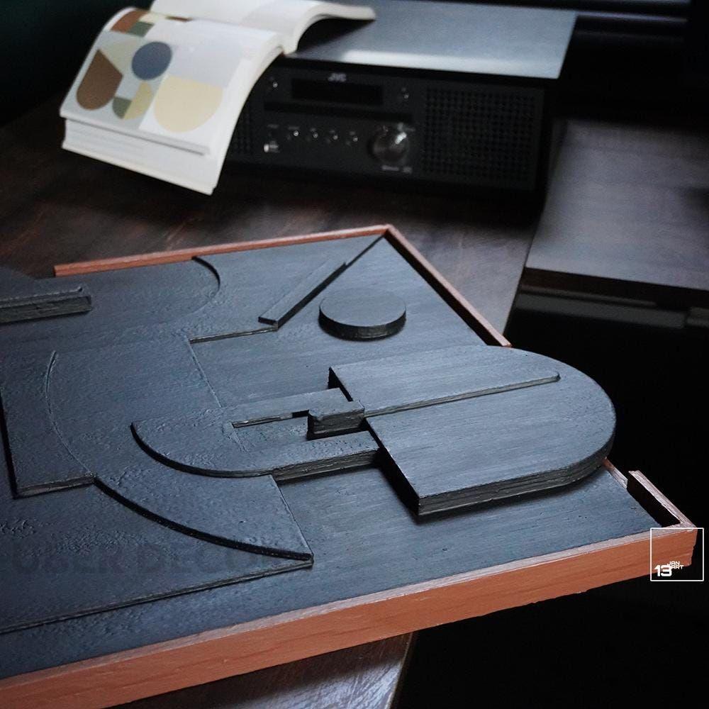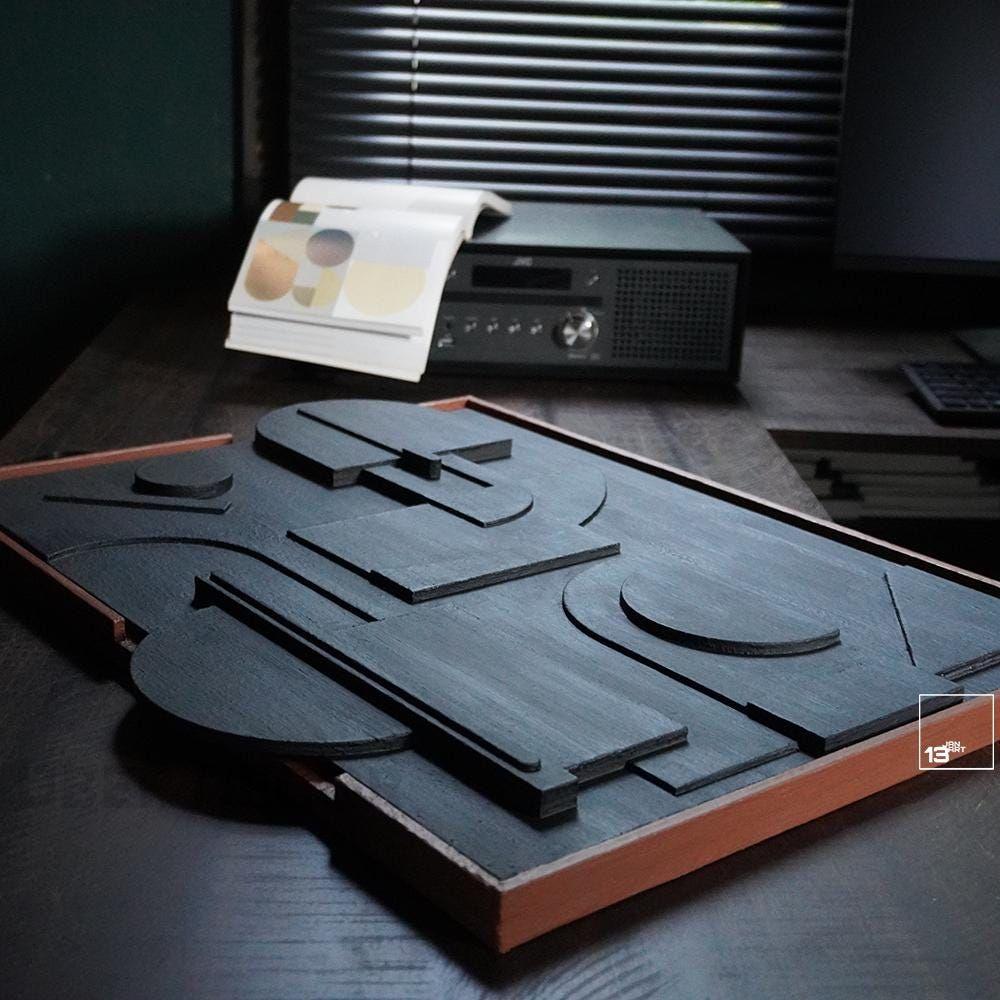 The design is defined by its minimalist and modern aesthetics, featuring clean lines and a harmonious blend of shapes and textures that offer a striking yet subtle presence. Perfect for those who appreciate minimalist home decor, this wooden wall art can be used to complement any style of interior design, from contemporary to Scandinavian or even industrial themes.