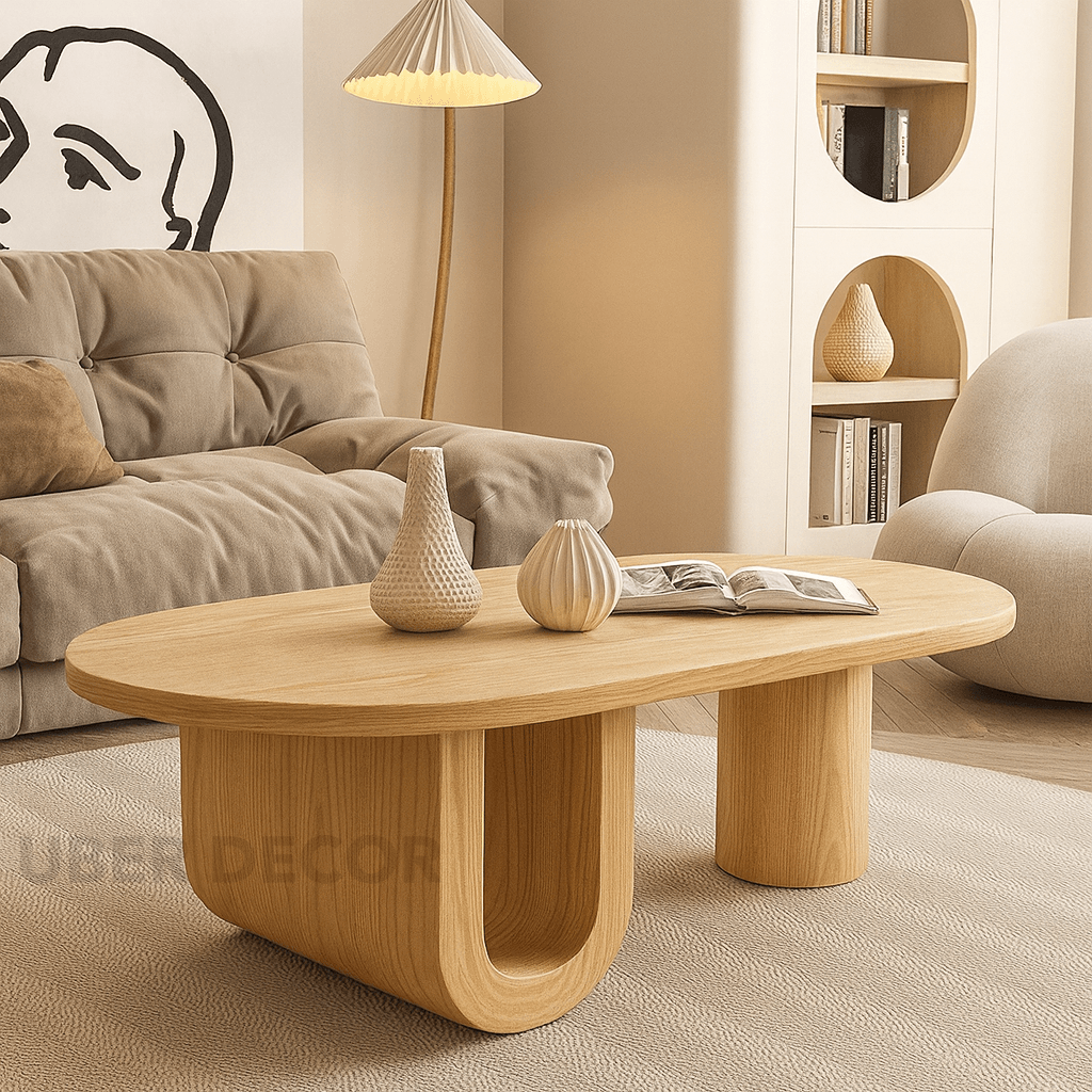 Jordan Shiro Japanese Minimalist Oval Coffee Table – White MDF Top with Solid Wood Legs, Matte Finish – Integrated Storage Shelf – Ideal for Living Room and Bedroom