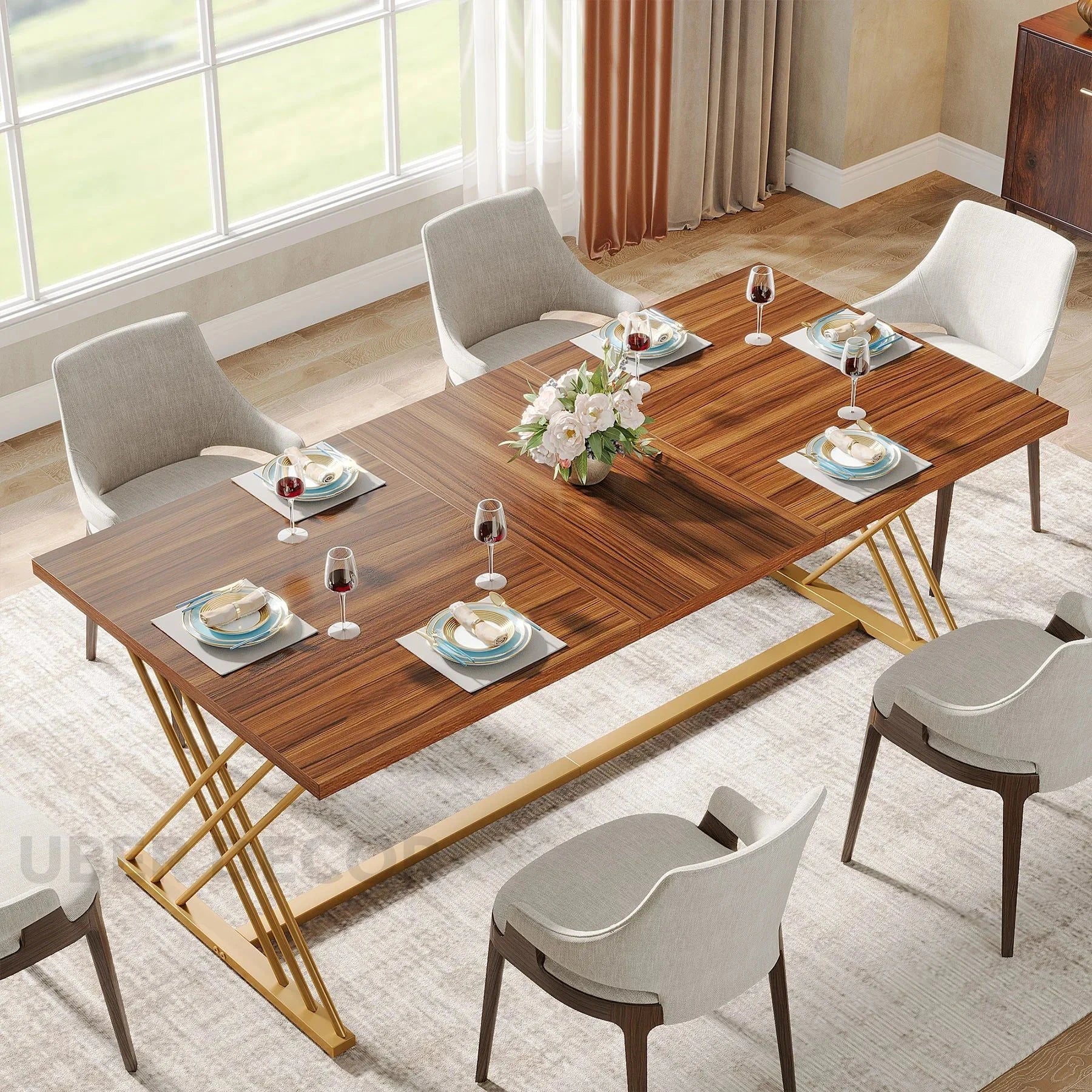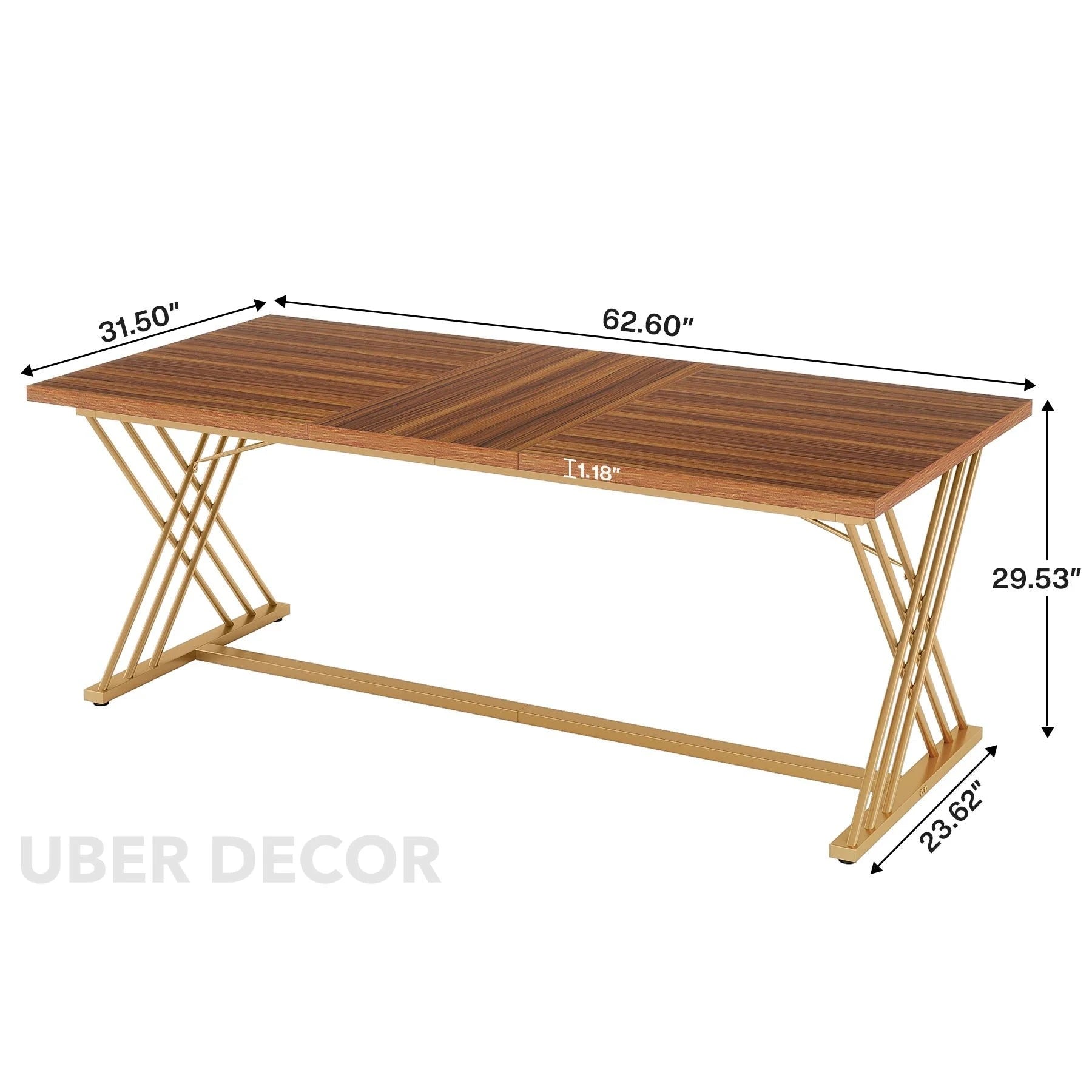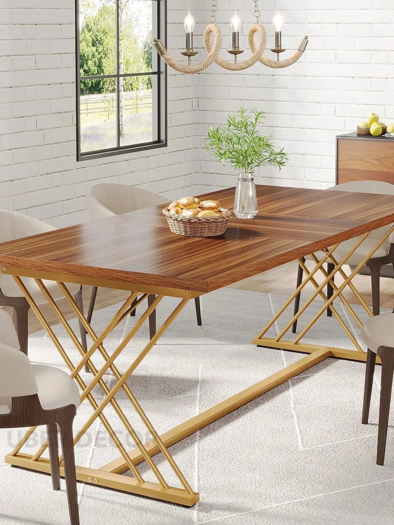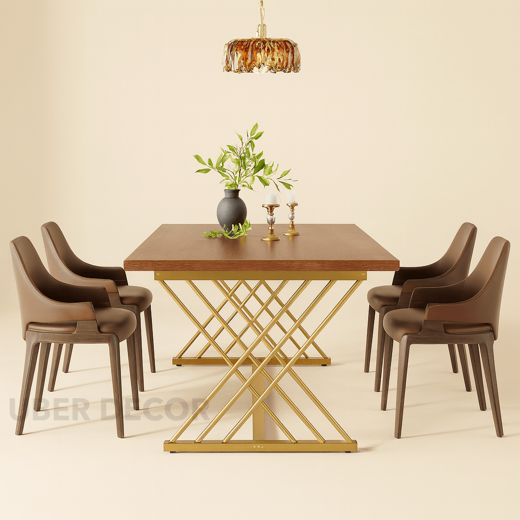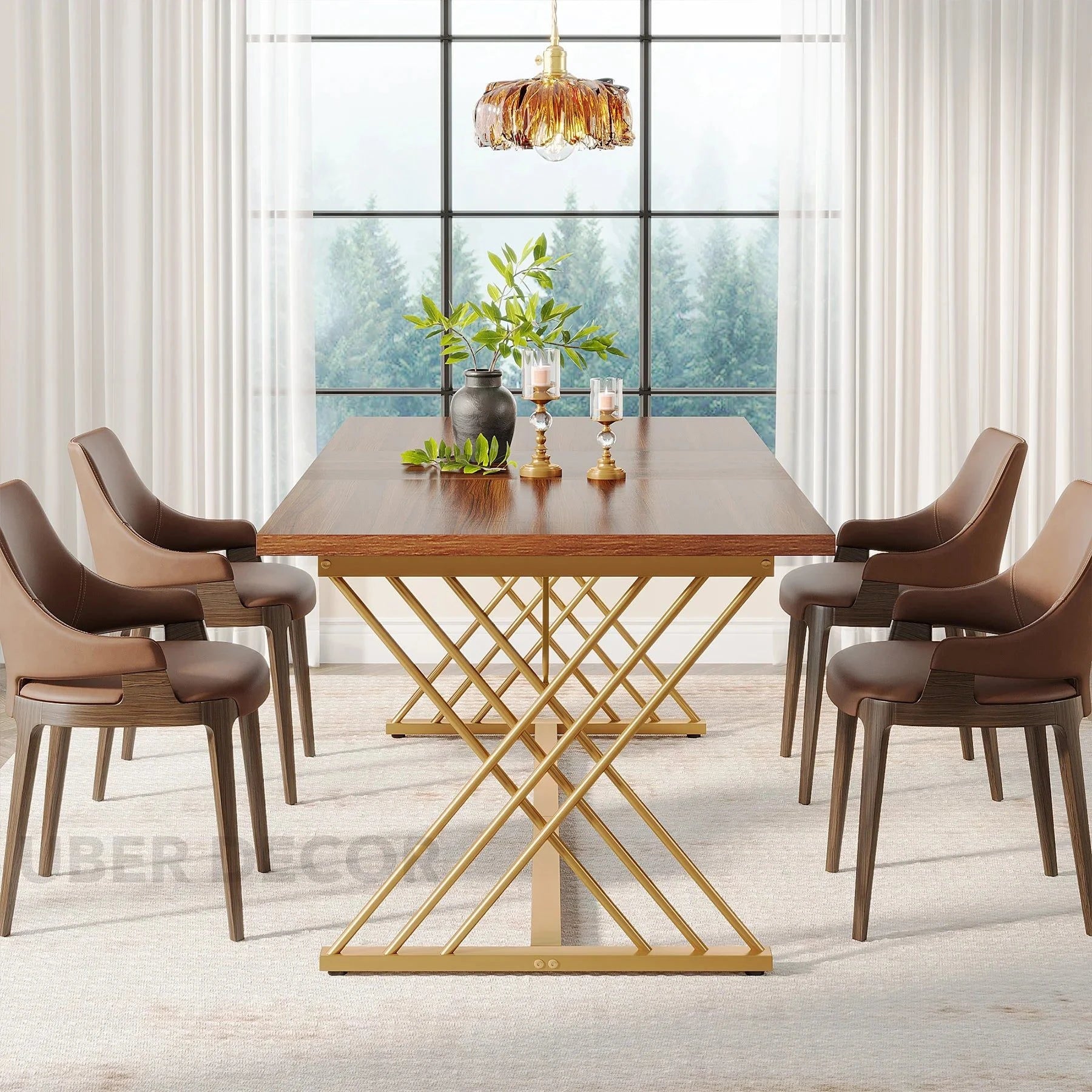 Maple Cross Modern Wooden Dining Table Set with Gold Stainless Steel Crisscross Base for Formal Dining Room