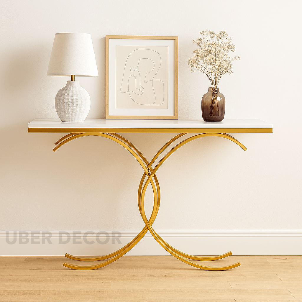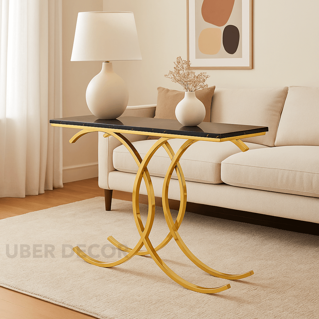 Orion Loop Display Table – Customizable Marble Top with Interlocking Gold Arch Base | Mid‑Century Modern Accent