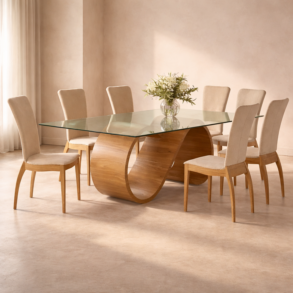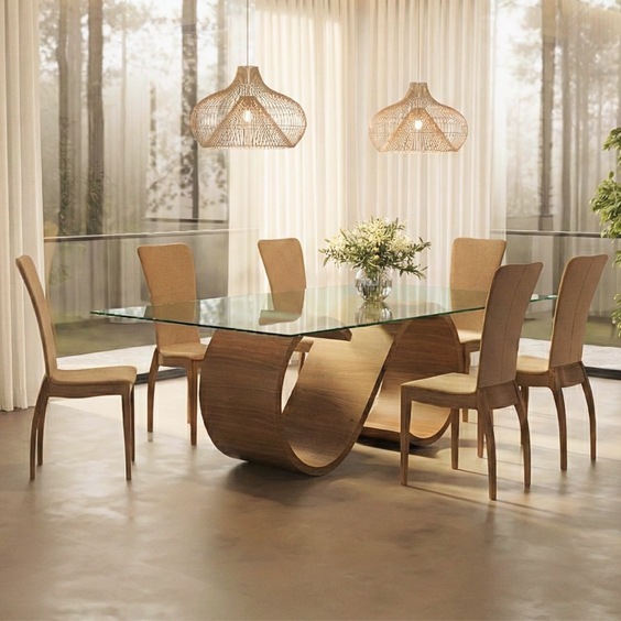 Timberly Dining Table with Tempered Glass Top and Solid Wood Sculptural Base Inspired by Warm Modern Homes and Elegant Dining Spaces