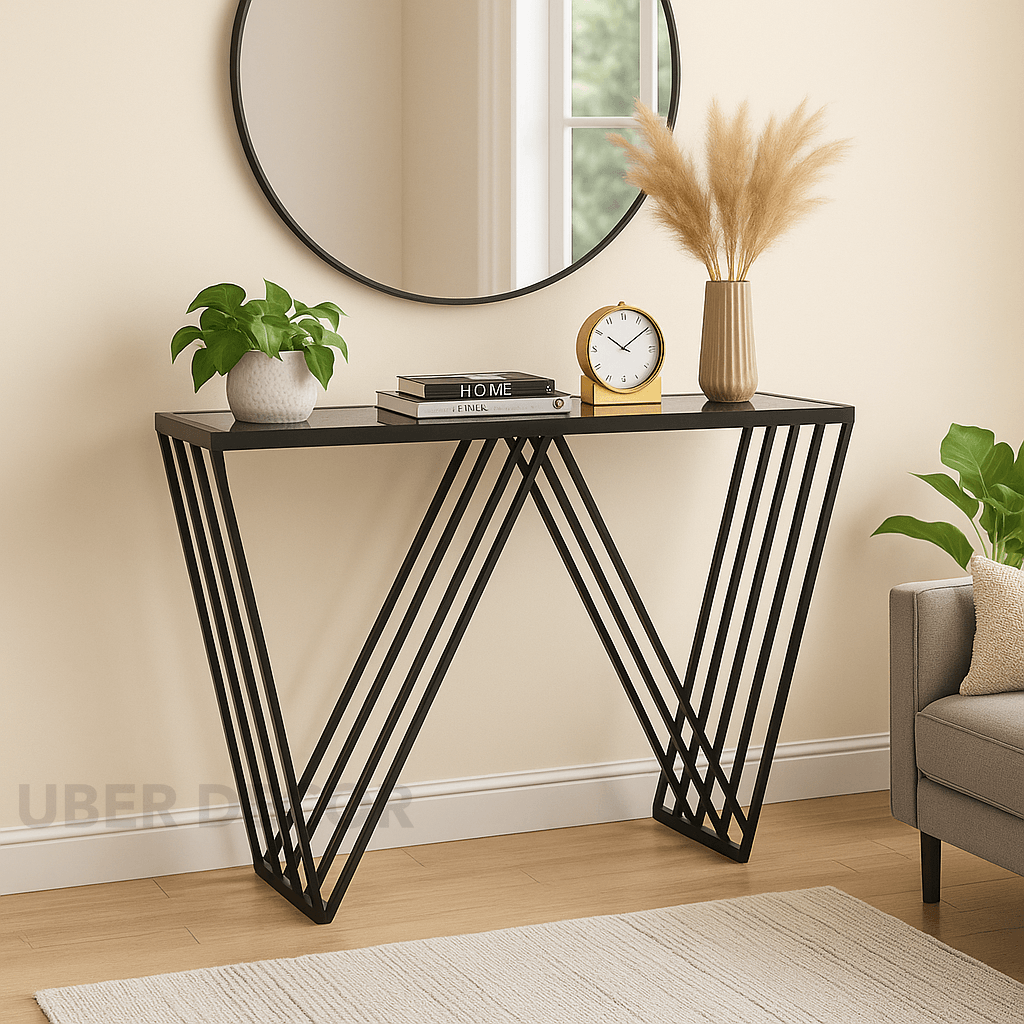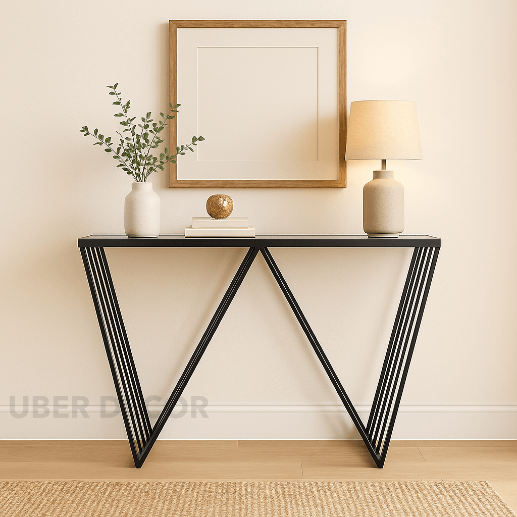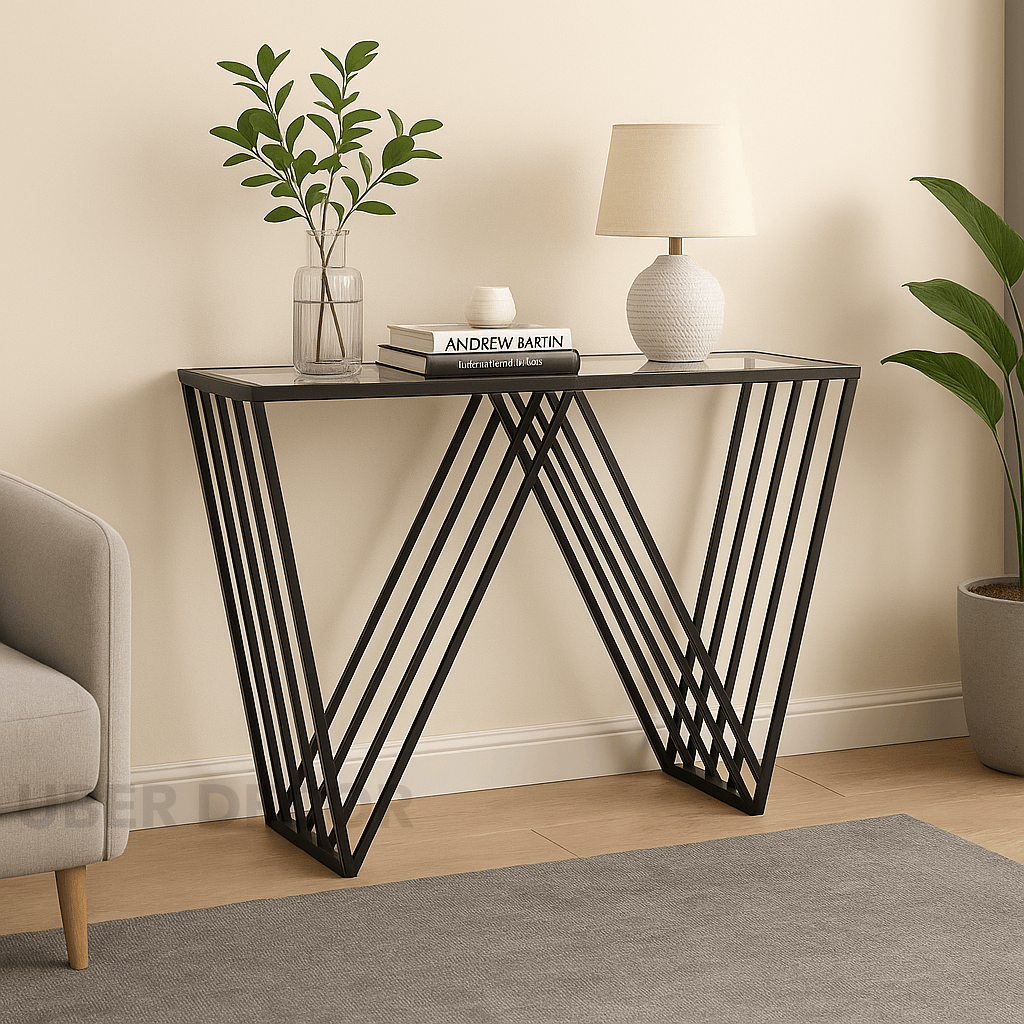 Veyron Edge Console Table – Glass Top with Sculptural W Metal Base Modern Entryway Accent